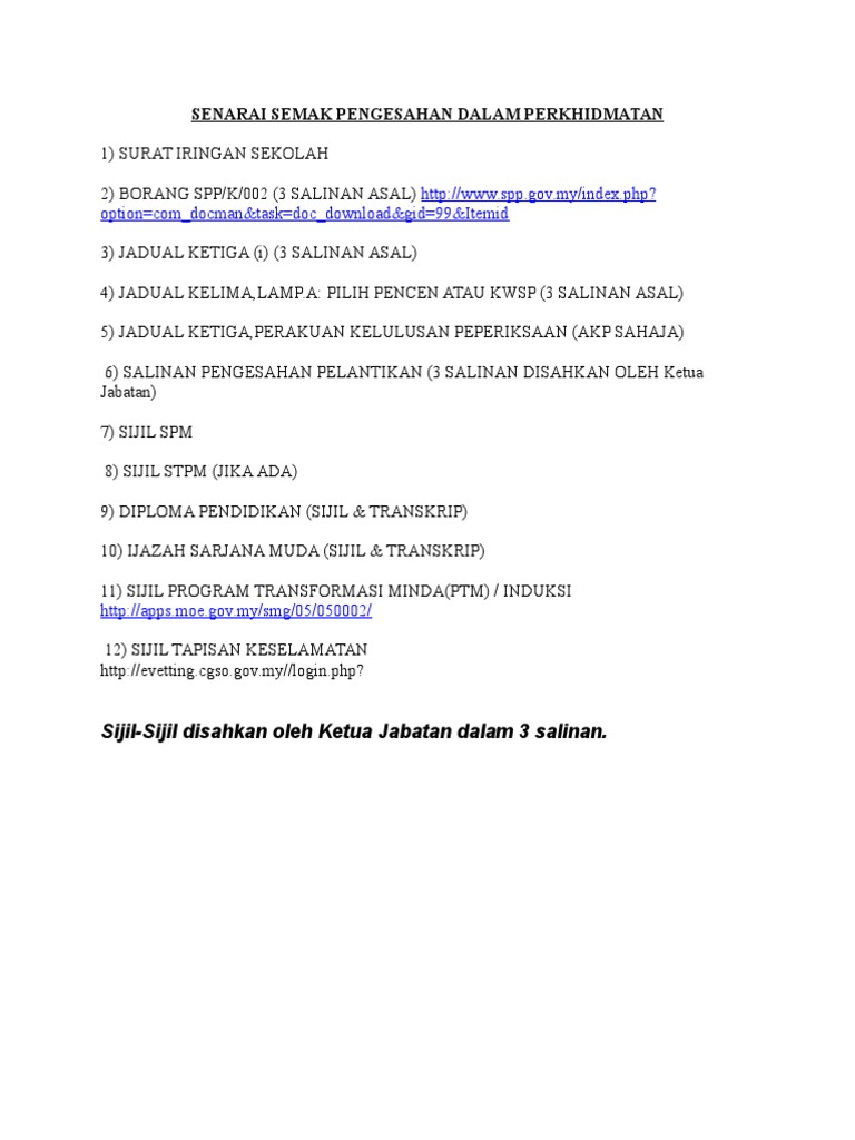 (sekiranya ketua jabatan gagal kemukakan perakuan pdp apabila pegawai telah layak). Dimana kelulusan dalam penilaian isac merupakan syarat wajib untuk pengesahan dalam perkhidmatan. Sebuah suruhanjaya perkhidmatan awam yang di teladani. Laman ini diwujudkan untuk orang awam memohon jawatan kosong dalam perkidmatan awam. Free prosedur pengesahan lantikan dan pengesahan dalam perkhidmatan mp3. Suruhanjaya perkhidmatan pelajaran malaysia bahagian perkhidmatan pengesahan dalam perkhidmatan arahan. Salinan kenyataan perkhidmatan yang dikemaskini; Dalam email tu, akan ada list dokumen yang korang wajib bawak dan photostat. Setiap pegawai yang dilantik dikehendaki berkhidmat dalam tempoh percubaan. Dalam contoh yang kedua ini dilampirkan contoh surat pengesahan jawatan yang dilampirkan oleh suruhanjaya perkhidmatan awam (spa). Permohonan jawatan adalah terhad kepada dasar one step lower iaitu Sebagai contoh, jika korang perasan, format soalan spa untuk jawatan gred n19 dan w19 untuk sesi 2018 berbeza dengan format 2019. Pendaftar institut tadbiran awam negara (intan) jabatan perkhidmatan awam malaysia intan kampus utama bukit kiara jalan bukit kiara 50480 kuala lumpur.
